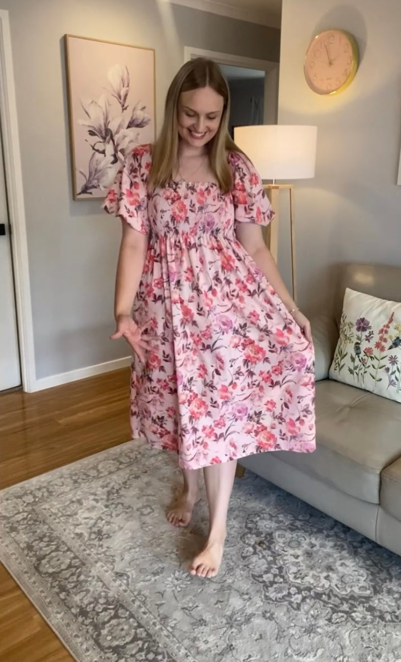 Shirred Midi Dress - Pink Floral